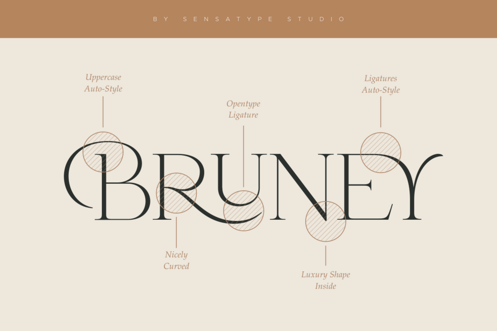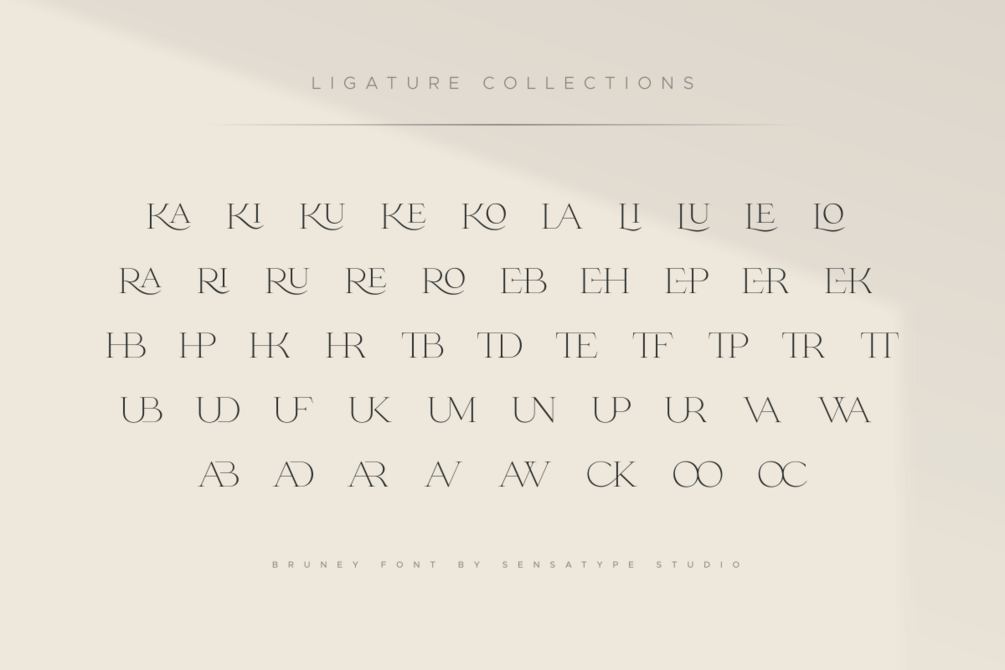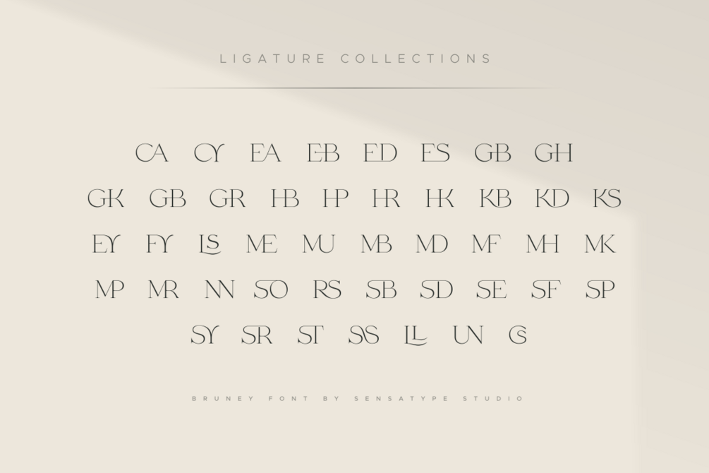 Bruney is a classy ligature font crafted to bring elegance and sophistication to your designs. With its beautifully connected ligatures, it’s ideal for luxury branding, logos, headlines, invitations, and editorial projects.